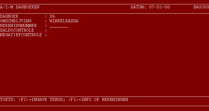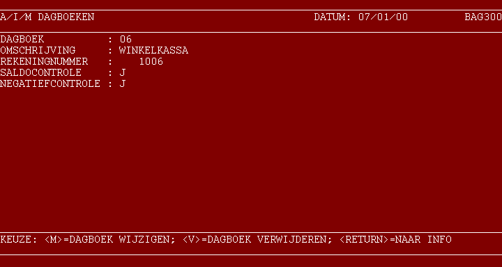 5 - Saldocontrole Geef in of een saldocontrole moet plaatsvinden (<J>) of niet (<N>). 6 - Negatiefcontrole Geef in of u een negatiefcontrole voor de gekoppelde tegenrekening wilt (<J>) of niet (<N>). 7 - Accoord? INGAVES GOED? <J>/<N> Wanneer u hier <N> antwoordt, kunt u de ingegeven rubrieken eventueel wijzigen, wanneer u hier <J> geeft wordt het nieuwe dagboek opgeslagen en keert u terug naar het eerste scherm.Verwijderen dagboek