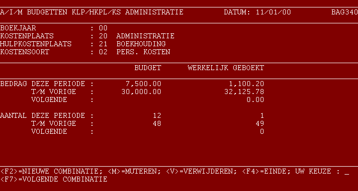 Werkwijze Waar dit onderin uw scherm vermeld staat kunt u bij een ingave steeds met de <F2>-toets een stap terug doen, of met de <F4>- toets het programma verlaten en terugkeren naar het menu. Ook kunt u met behulp van de <F3>- of <F7>-toets zoeken naar bestaande combinaties van kp, hkp en ks. In dit programma in te geven kostenplaatsen, hulpkostenplaatsen en kostensoorten moeten bekend zijn in het systeem (aangemaakt met programma 104). Kosten- en hulpkostenplaatsen 00 en 99 zijn echter zonder meer toegestaan. Na ingave of selectie van een reeds bestaande combinatie komt u in de info-/mutatietak. 1 - Start programma 106. Wanneer twee boekjaren openstaan kunt u, alvorens de combinatie van KP, HKP en KS in te gaan voeren, het boekjaar ingeven waarvoor het eventuele budget gaat gelden. 2 - Kostenplaats Geef de kostenplaats in voor deze combinatie. U kunt de <F1>-toets gebruiken om naar kostenplaatsen te zoeken. 3 - Hulpkostenplaats Geef de bijbehorende hulpkostenplaats in. Wanneer u in het geheel geen HKP's gebruikt wordt deze ingave auto- matisch overgeslagen en HKP 00 gehanteerd. U kunt de <F1>-toets gebruiken om naar hulpkostenplaatsen te zoeken. 4 - Kostensoort Geef de bijbehorende kostensoort in. U kunt de <F1>-toets gebruiken om naar kostensoorten te zoeken. De basisgegevens zijn nu ingevoerd; vervolgens kunt u budget- bedragen en geboekte bedragen invoeren. Ook wanneer u (nog) niet wilt budgetteren voor deze combinatie dienen de volgende ingaves gedaan te worden. In dat geval kunt u de voor u niet relevante rubrieken de waarde 0 geven. 5 - Budgetbedrag Geef het voor deze combinatie geldende budgetbedrag in. deze periode Maximaal 99.999.999,99 positief of negatief. Het budgetbedrag geldt voor elke boekingsperiode. 6 - Budgetbedrag Indien voor het betreffende boekjaar al periodes afgesloten t/m vorige per. zijn, kunt u het cumulatieve bedrag van de reeds afgesloten periodes ingeven. Ook hier geldt een maximum toegestane waarde van 99.999.999,99 positief of negatief. 7 - Geboekt bedrag Wanneer in de lopende periode reeds boekingen zijn gedaan deze periode die op deze combinatie betrekking hebben, kunt u het bedrag van de boekingen hier ingeven. 8 - Geboekt bedrag Indien voor het betreffende boekjaar reeds periodes zijn t/m vorige per. afgesloten, kunt u het cumulatieve geboekte bedrag van de reeds afgesloten periodes ingeven. 9 - Geboekt bedrag Als ook in een volgende boekingsperiode al boekingen zijn volgende periode verricht voor deze combinatie kan ook het totaalbedrag van die boekingen worden ingebracht. 10 - Aantallen Vervolgens kunnen budgetaantallen en geboekte aantallen worden ingegeven. Wanneer de systeemparameters aangeven dat u niet met aantallen werkt gaat u automatisch naar punt 16. 11 - Budgetaantal Geef het voor deze combinatie geldende budgetaantal in. deze periode Maximaal 999999 positief of negatief. Het budget geldt voor elke boekingsperiode. 12 - Budgetaantal Indien voor het betreffende boekjaar reeds periodes zijn t/m vorige per. afgesloten, kunt u het cumulatieve aantal van de afgesloten perio- des ingeven. Hier geldt een maximum waarde van: 9.999.999 (positief of negatief). 13 - Geboekt aantal Wanneer in de lopende periode reeds boekingen zijn gedaan deze periode die op deze combinatie betrekking hebben, kunt u het al geboekte aantal hier ingeven. 14 - Geboekt aantal Indien voor het betreffende boekjaar reeds periodes zijn t/m vorige per. afgesloten, kunt u het totaal geboekte aantal van de afgesloten periodes ingeven. 15 - Geboekt aantal Als ook in een volgende boekingsperiode al boekingen zijn volgende periode verricht voor deze combinatie kan ook het geboekte aantal van die mutaties worden ingebracht. 16 - Akkoord INGAVES AKKOORD? <RETURN>/<N> Wanneer u aangeeft niet akkoord te zijn met de ingaves keert u terug naar ingave budgetbedrag, vanaf waar u gecorrigeerde bedragen en/of aantallen kunt inbrengen. Gaat u wel akkoord, dan wordt de combinatie vastgelegd met de eventuele bedragen en aantallen en keert u terug naar ingave Kostenplaats (punt 2).Bekijken, wijzigen of verwijderen van bestaande combinaties