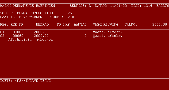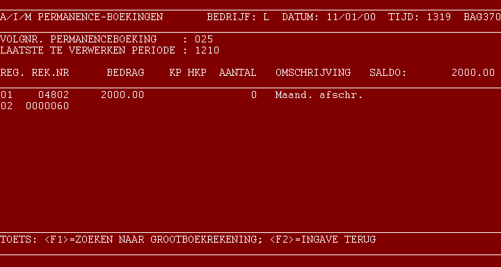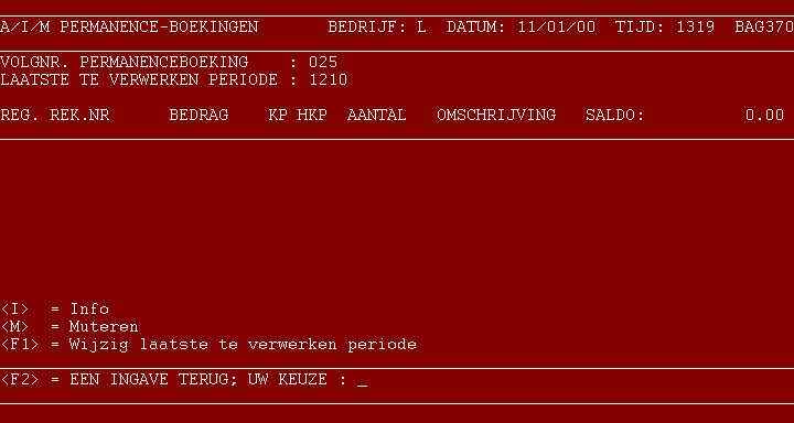 <I>=INFO De bij dit boekingsvolgnummer behorende regels verschijnen op uw beeldscherm; is er voor het tonen van alle regels niet genoeg ruimte op het scherm, dan krijgt u de mogelijkheid om door te bladeren. Na beëindiging van de info keert u terug naar ingave volgnummer. <F1>=MUTEREN LAATSTE TE VERWERKEN PERIODE Na deze keuze heeft u de mogelijkheid de geldigheidsduur van het gekozen volgnummer te verlengen of te verkorten. Na ingave van de nieuwe eindperiode en bevestiging daarvan komt u weer bij ingave van het volgnummer. <M>=MUTEREN Zie hieronder. 4 - Wijzigen De bij dit volgnummer behorende regels verschijnen in uw scherm; u kunt, indien nodig, met de <F3>-toets bladeren. U krijgt de keuze uit de volgende mogelijkheden: <F1>=BOEKING VERWIJDEREN Kies hiervoor om het volgnummer met alle aanwezige boekingsregels in één keer te verwijderen. Na deze keuze vraagt het programma nogmaals om bevestiging van uw ingave. Na het verwijderen, of het herroepen van de opdracht tot verwijderen keert u terug naar ingave volgnummer. REGELNUMMER: Geef het nummer in van de te wijzigen of te verwijderen boekings- regel; zie hieronder. 5 - Wijzigen regel Na ingave van het nummer van de te wijzigen regel kunt u kiezen of u deze regel wilt verwijderen, dan wel wijzigen. Let op! Na het verwijderen van een boekingsregel of het wijzigen van het bedrag van een regel zijn debet en credit van het volgnummer niet meer met elkaar in evenwicht. U dient dan de overige regels dusda- danig aan te passen (of een nieuwe regel toe te voegen), dat het evenwicht weer wordt hersteld, waarna het wijzigen beëindigd kan worden. 6 - Toevoegen regel Wanneer u een nieuwe regel aan het volgnummer wilt toevoegen, geeft u bij ingave regelnummer (zie punt 4) een (nog) niet bestaand regelnummer in; waarna het systeem u zal vragen: REGEL KOMT NIET VOOR; TOEVOEGEN? <J>/<RETURN> Na het antwoord J kunt u een nieuwe regel toevoegen. 7 - Vervolg Nadat een regel is gewijzigd, verwijderd of toegevoegd keert u terug naar punt 4. 108