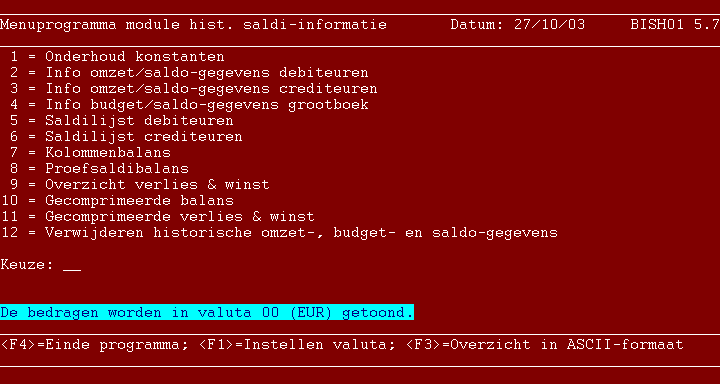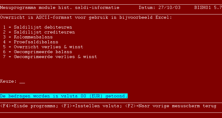 Programmanummer: 124 Omschrijving : HIST.SALDI INFO/OVZ. Programmanaam : BISH00Uiteraard mag het programma ook op een andere plaats in het menu worden opgenomen. Wanneer u met meerdere bedrijven werkt, moet dit programma in elk bedrijf afzonderlijk in het menu worden geplaatst.