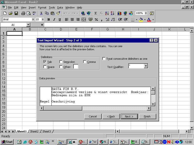 Omdat voor dit importbestand als scheidingsteken de 'TAB' opgegeven is, hoeft u hier niets te doen. Heeft u echter voor de komma of de puntkomma gekozen, dan dient u dit in stap 2 aan te vinken en de tab-optie uit te zetten. De 'Text Qualifier' op het dubbele aanhalingsteken laten staan. Klik op 'next'.