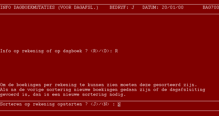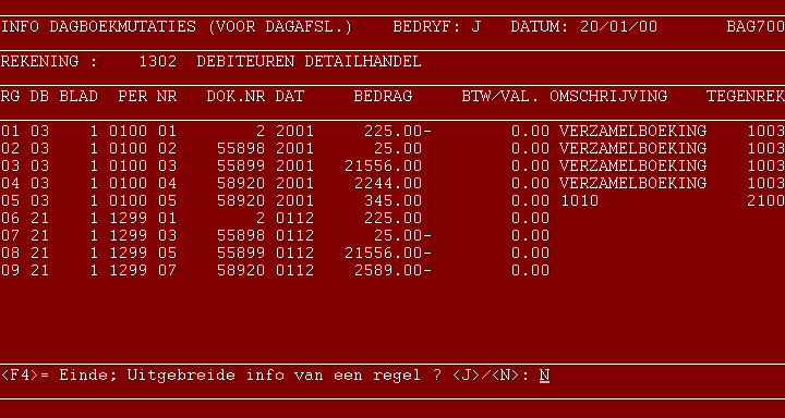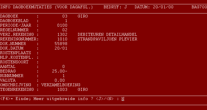 5 - Uitgebreide info UITGEBREIDE INFO VAN EEN REGEL? Wanneer u uitgebreide informatie wenst kunt u vervolgens ingeven van welke regel, waarna een meer gedetailleerd scherm u de gevraagde informatie toont. Wanneer u dit niet wenst kunt u verder bladeren door de journaalpos- ten van de gekozen rekening. Wanneer u aan het eind hiervan bent gekomen keert u terug naar ingave rekeningnummer. Zie voor een schermvoorbeeld van de uitgebreide informatie iets verderop.Bekijken van informatie per dagboek