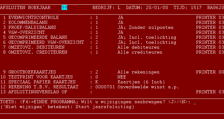 Werkwijze Start programma 143. Wanneer geen van de eerder genoemde foutmeldingen verschijnt wordt uw scherm gevuld met de voorkeurinstellingen van de periode-afsluiting. 1 - Wijzigen? Geef aan of u één of meer rubrieken wilt wijzigen. Aangebrachte wijzigingen zijn eenmalig en gelden slechts voor deze afsluiting. Wanneer u aangeeft niets te willen wijzigen wordt de afsluiting vervolgens uitgevoerd.