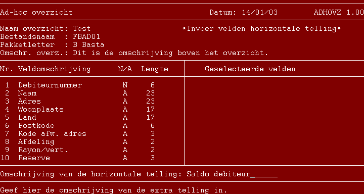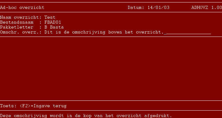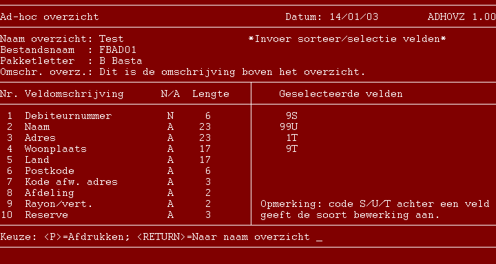 Met dit programma kan een ad-hoc overzicht aangemaakt en afgedrukt worden. De stuurgegevens, die bepalen hoe het overzicht samengesteld is, worden ook voor later gebruik opgeslagen. Op de laatste regel van het scherm wordt zoveel mogelijk aanvullende informatie gegeven.