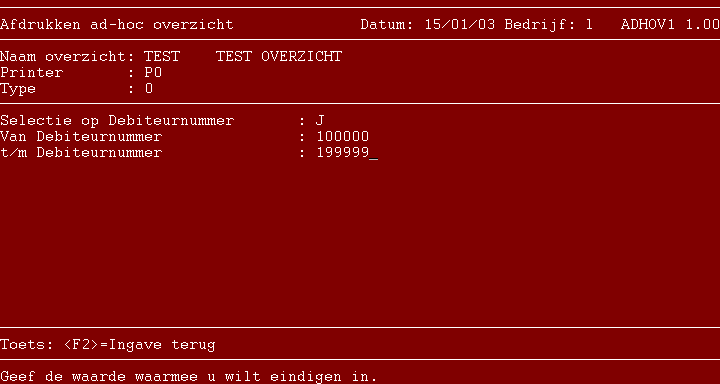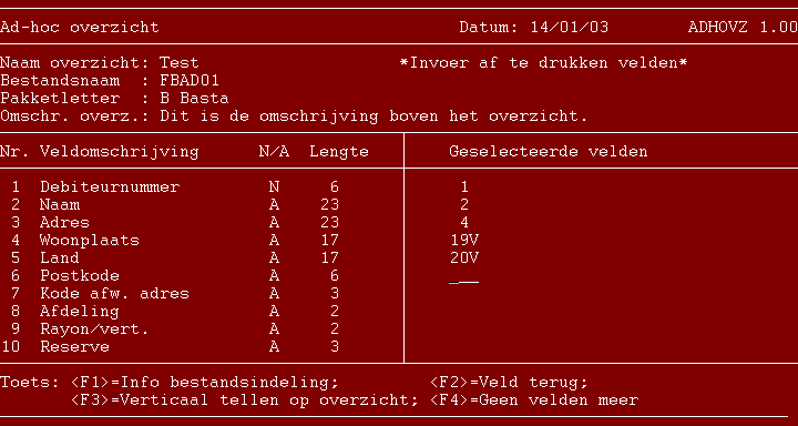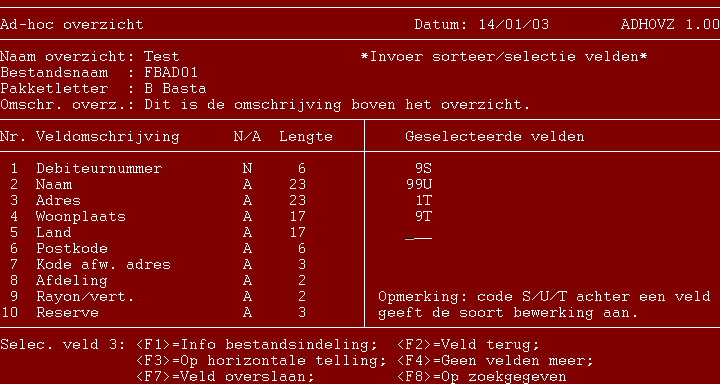 Tip: Als men voor veld 1 (in de meeste bestanden de sleutel van het bestand, bijvoorbeeld het debiteurnummr) verschillende series van dat veld wil afdrukken door 3 of 4 keer op hetzelfde veld te selecteren (de zgn. "of"-selectie), dan mag u selectieveld 1 niet daarvoor gebruiken. Bij de invoer van de gegevens voor het overzicht dat veld overslaan via de F7-functietoets. Bij gebruik van selectieveld 1 in combinatie met veldnummer 1 wordt een rechtstreekse positionering via de sleutel van het bestand uitgevoerd (snelheid!) en dan kan niet meer gekeken worden of dat veldnummer ook als selectieveld 2, 3, 4 of 5 gebruikt is. Bij gebruik van veldnummer 1 bij selectieveld 2 t/m 5 wordt geen gebruik van deze positionering gemaakt, en dan lukt deze "truc" wel om meerdere series van een sleutelveld af te drukken (maximaal 4 series per overzicht).