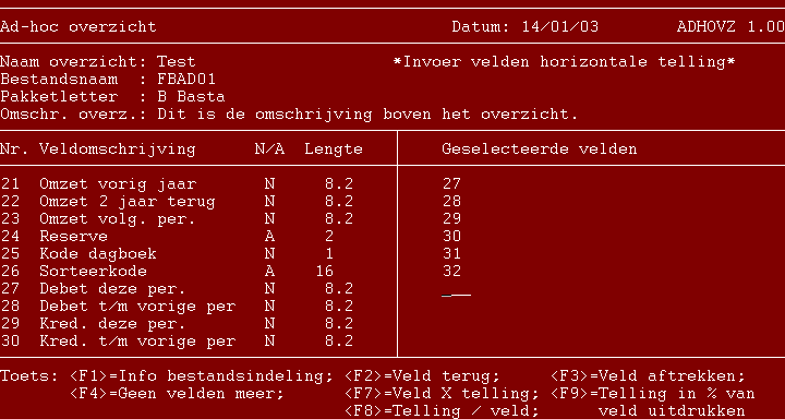 Op het scherm verschijnt de indeling van het gekozen bestand. Met functietoets F1 kan door de bestandsindeling in het linkerdeel van het beeldscherm "gebladerd" worden. Ingave: - Veldnummer van het af te drukken veld 2 N De op het overzicht af te drukken velden kunnen ingegeven worden. De volgorde van de af te drukken velden is volkomen vrij. Het veldnummer, dat inge- geven moet worden, staat in de kolom onder "Nr.". De geselecteerde velden staan in het rechterdeel van het beeldscherm. Als van een af te drukken veld een verticale tel- ling gemaakt moet worden, dan moet het veld met functietoets F3 worden ingegeven. Achter het veldnummer wordt dan een "V" afgebeeld. Met functietoets F4 kan dit programma-onderdeel verlaten worden, en wordt het volgende onderdeel, invoer velden horizontale telling, gestart.
