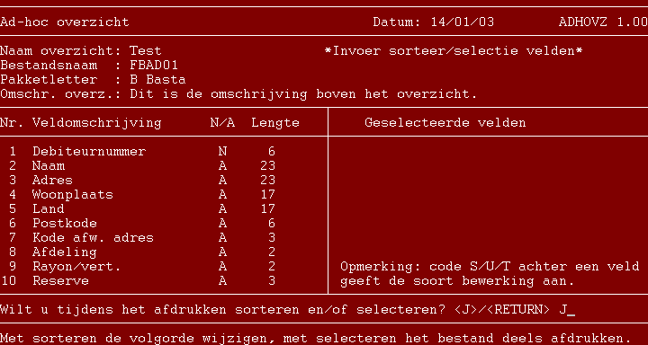 Ingave: - Selectie op <Naam veld> 1 A/N Deze vraag met J of N beantwoorden. Wordt voor 'N' gekozen, dan vindt op dit veld geen selectie plaats. Bij de tweede en volgende selectie kan men via functie- toets F2 naar het vorige selectieveld terugkeren. Ingave: - Van <Naam veld> max. lengte uit bestandsindeling Met functietoets F2 terug naar de vorige ingave. Ingave: - T/m <Naam veld> max. lengte uit bestandsindeling Met functietoets F2 terug naar de vorige ingave.Na een keuze of de selectiegegevens goed zijn (respectievelijk J of N ingeven) wordt het volgende programma-onderdeel, de sortering, gestart.