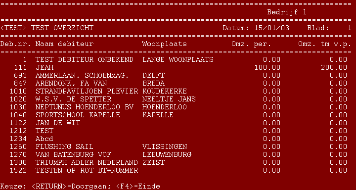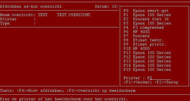 Is gekozen voor afdrukken naar het beeldscherm, dan volgt na ieder scherm de keuze "<RETURN>=Doorgaan; <F4>=Einde". Na RETURN volgt het volgende scherm en na F4 gaat het programma terug naar het ingeven van de stuurgegevens voor een overzicht. Na het laatste scherm kan alleen RETURN gegeven worden en daarna gaat het programma ook terug naar het ingeven van de stuurgegevens voor een overzicht.