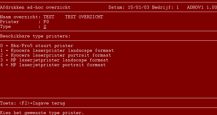 Na het afdrukken gaat het programma terug naar het ingeven van de stuurgegevens voor een overzicht.