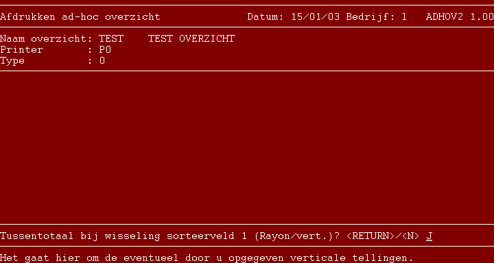 Na een keuze ingaven goed (respectievelijk J of N ingeven) wordt het volgende programma-onderdeel, invoer af te drukken velden, gestart.