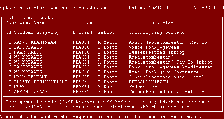 Vanaf versie 5.7 kan tijdens de bestaande functie "zoeken bestand" de <F7>-toets gebruikt worden om de nieuwe functie "Help me met zoeken" te starten. Deze nieuwe functie kan in de database met bestandsindelingen naar bestanden zoe- ken aan de hand van maximaal twee in te geven willekeurige zoektermen. Het maakt niet uit of deze zoektermen met 'HOOFDLETTERS' of 'kleine letters' worden ingegeven. In het geval van twee zoektermen kiest u of beide zoektermen in de betreffende bestandsindeling aanwezig moeten zijn (de tweede zoekterm achter 'en:' invullen) of dat één van beide termen aanwezig moet zijn (de tweede zoekterm achter 'of:' invullen en de zoekterm achter 'en:' leeg- laten). Vervolgens wordt de database doorgelezen en toont het programma alle bestanden, waarin de ingegeven zoek- termen volgens de gekozen selectie aanwezig zijn. De ge- vonden veldomschrijving(en), de bestandsnaam, de pakket- letter en de omschrijving van het bestand worden getoond. Uiteraard is vooruit en achteruit bladeren mogelijk. Selecteert u een bepaalde bestandsindeling voor gebruik, dan worden bestandsnaam en pakketletter mee teruggenomen naar het ingaveveld, waarop de oorspronkelijke zoekfunctie gestart werd. Via de <F3>-toets kan in deze zoekfunctie een andere zoekterm geprobeerd worden en via de <F4>-toets kan teruggegaan worden naar de plaats waar <F7> gegeven werd in het zoekscherm voor de bestanden. Ingave: - Pakketletter (mogelijke waarden: A = Agfta, 1 A/N B = Basta, D = Drankta, K = Kavta, M = Meuta). Met functietoets F3 kan naar de aanwezige pakket- ten gezocht worden. Ingave: - Omschrijving overzicht max. 60 A/N Hier kan de omschrijving van het overzicht worden ingegeven. Deze wordt in de kop van het overzicht afgedrukt. In deze omschrijving mogen ook een aantal stuurgegevens worden opgenomen, n.l.: * Als in dit veld ergens *B* staat, dan wordt na de afdruk van een subtotaal (waar op het overzicht een "S" achter staat) een bladwissel geforceerd. * Als in dit veld ergens *I11* staat, dan kan het overzicht ook op 11 inch papier afgedrukt worden.