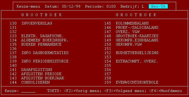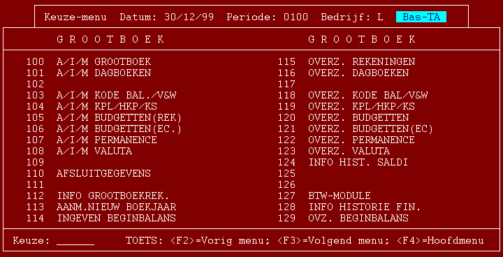 De grootboekprogramma's zijn verdeeld over twee submenu's. In grote lijnen bevat het eerste submenu de programma's die het inbrengen en bekijken van de stamgegevens betreffen. Programma's 124, 127 en 128 zijn hierop een uitzondering.