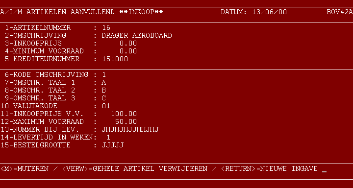 De bediening voor dit programma is gelijk aan dat van een 'gewoon' A/I/M Programma, met dien verstande, dat als gekozen wordt voor het verwijderen van een artikel, alle gegevens van dat artikel verwijderd worden. Volg verder de aanwijzingen op het beeldscherm.