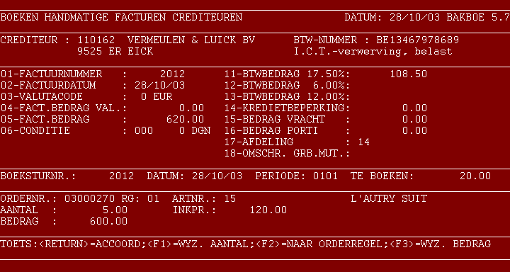 Na identificatie van de crediteur via zijn nummer of zoeksleutel en het accoord voor de juiste crediteur worden de factuurgegevens op het scherm ingevoerd.