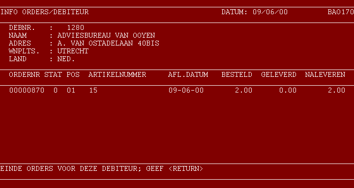 Met dit programma kunt u per debiteur de orders op het beeldscherm roepen, waarbij zoeken op debiteurzoeksleutel en zoeken naar orders mogelijk is.