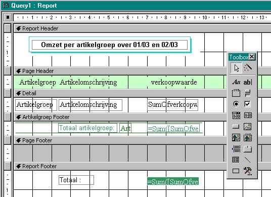 Als men een element aan het ontwerp wenst toe te voegen, klikt men in de toolbox met besturingselementen op het gewenste icoontje, gaat in het ontwerp op de gewenste plek staan en klikt daar nog eens, om het element op die plaats te verankeren. In de toolbox staan diverse controls. Een aantal daarvan zal men bij het ontwerpen van een rapport zelden gebruiken. Die komen meer tot hun recht bij het ontwerpen van formulieren. Voor de meeste rapporten zal men met vier icoontjes prima uit de voeten kunnen: