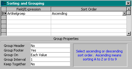 Het veldtype bepaalt wat voor type groepering mogelijk is. Elk type kan gegroepeerd worden op 'elke waarde'. Als men voor deze optie kiest en tevens geen groepstekst afdrukt, wordt er alleen gesorteerd en niet gegroepeerd.