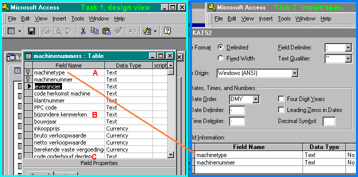 Het is bij het invoeren van de velden niet mogelijk om te schakelen tussen import specification en tabel indeling, wat onhandig is, omdat men de veldnamen en -typen uit de tabel nodig heeft. Het beste kan men daarom twee Access taken openen. Zo kan men via de ene taak de tabel indeling bekijken en via de andere de veldgegevens bijwerken. Daarbij kan men ook meteen kopiëren en plakken. Hieronder een afbeelding om een idee te geven hoe het er op het scherm uit komt te zien. De ene taak is hierbij omgeven door een lichtblauwe rand en de andere taak voor een donkerblauwe rand. De oranje lijn geeft aan welke omschrijvingen worden overgenomen.