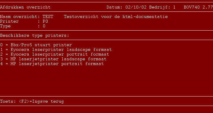 Ingave: - Naam overzicht max. 6 A/N Met functietoets F3 kan een overzicht van de over- zichten, waaruit een keuze gemaakt kan worden, op het beeldscherm opgeroepen worden. Ingave: - Printer max. 3 A/N Het overzicht wordt op de opgegeven printer afgedrukt. Met functietoets F3 kan het overzicht i.p.v. op een printer op het beeldscherm zichtbaar gemaakt worden. Ingave: - Type printer of beeldscherm 1 A/N Op het beeldscherm is een overzicht van de mogelijke types printers of beeldschermen zichtbaar. Kies het juiste type dat bij de vorige keuze hoort.Na een keuze ingaven goed (respectievelijk J of N ingeven) wordt het volgende programma-onderdeel, ingeven selecties, gestart.