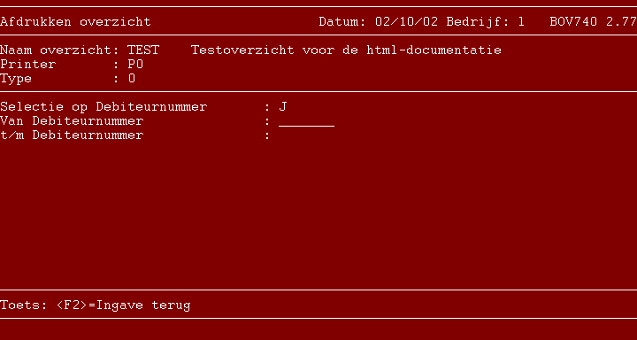 Tip: Als men voor veld 1 (in de meeste bestanden de sleutel van het bestand, bijvoorbeeld het debiteurnummr) verschillende series van dat veld wil afdrukken door 3 of 4 keer op hetzelfde veld te selecteren (de zgn. "of"-selectie), dan mag u selectieveld 1 niet daarvoor gebruiken. Bij de invoer van de gegevens voor het overzicht dat veld overslaan via de F7-functietoets. Bij gebruik van selectieveld 1 in combinatie met veldnummer 1 wordt een rechtstreekse positionering via de sleutel van het bestand uitgevoerd (snelheid!) en dan kan niet meer gekeken worden of dat veldnummer ook als selectieveld 2, 3, 4 of 5 gebruikt is. Bij gebruik van veldnummer 1 bij selectieveld 2 t/m 5 wordt geen gebruik van deze positionering gemaakt, en dan lukt deze "truc" wel om meerdere series van een sleutelveld af te drukken (maximaal 4 series per overzicht).