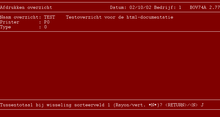 Het overzicht wordt afgedrukt. Op het beeldscherm is het afdrukken te volgen. Door een bepaalde toetsencombinatie te drukken kan het afdrukken probleemloos afgebroken worden. Deze combinatie is afhankelijk van systeeminstellingen en onderliggend operating system (unix, dos, windows). Meestal is het de <ESCAPE>-toets of de combinatie <CONTROL>/<BREAK>.