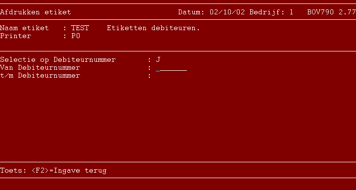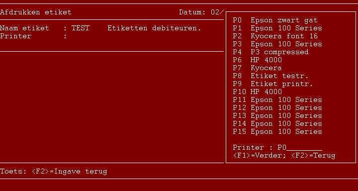 Ingave: - Naam etiket max. 6 A/N Met functietoets F3 kan een overzicht van de eti- ketten, waaruit een keuze gemaakt kan worden, op het beeldscherm opgeroepen worden. Ingave: - Printer max. 3 A/N De etiketten worden op de opgegeven printer afgedrukt.Na een keuze ingaven goed (respectievelijk J of N ingeven) wordt het volgende programma-onderdeel, ingeven selecties, gestart. Bij dit programma-onderdeel wordt niet om een "Type printer" gevraagd, omdat voor het afdrukken van etiketten geen verdere stuurcodes voor de printer nodig zijn.