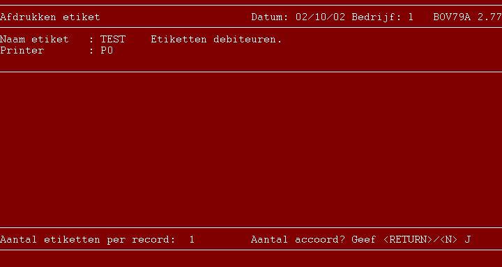 De vraag Instelling afdrukken <RETURN>/<N> wordt gesteld. Als een N wordt ingegeven, dan wordt het afdrukken van de etiketten gestart. In het andere geval wordt een instelling afgedrukt. De vraag Instelling akkoord <RETURN>/<N> volgt daarna. Als een N wordt ingegeven, dan wordt de instelling herhaald.