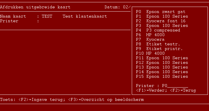 Ingave: - Naam kaart max. 6 A/N Met functietoets F3 kan een overzicht van de kaar- ten, waaruit een keuze gemaakt kan worden, op het beeldscherm opgeroepen worden. Ingave: - Printer max. 3 A/N De kaarten worden op de opgegeven printer afgedrukt. Met functietoets F3 kunnen de kaarten i.p.v. op een printer op het beeldscherm zichtbaar gemaakt worden.Na een keuze ingaven goed (respectievelijk J of N ingeven) wordt het volgende programma-onderdeel, ingeven selecties, gestart. Bij dit programma-onderdeel wordt niet om een "Type printer" gevraagd, omdat voor het afdrukken van dit type kaart of overzicht geen verdere stuurcodes voor de printer nodig zijn.