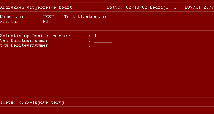 Ingave: - Selektie op <Naam veld> 1 A/N Deze vraag met J of N beantwoorden. Wordt voor 'N' gekozen, dan vindt op dit veld geen selectie plaats. Bij de tweede selectie kan men via functietoets F2 naar het vorige selectieveld terugkeren. Ingave: - Van <Naam veld> max. lengte uit bestandsindeling Met functietoets F2 terug naar de vorige ingave. Ingave: - T/m <Naam veld> max. lengte uit bestandsindeling Met functietoets F2 terug naar de vorige ingave.Na een keuze ingaven goed (respectievelijk J of N ingeven) kan de volgende selectie worden ingegeven, of wordt het volgende programma-onderdeel, de sortering, gestart.