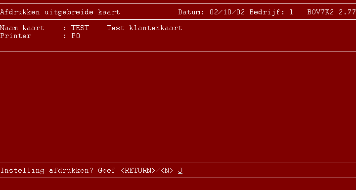 De vraag Instelling afdrukken <RETURN>/<N> wordt gesteld. Als een N wordt ingegeven, dan wordt het afdrukken van de kaarten gestart. In het andere geval wordt een instelling afgedrukt. De vraag Instelling akkoord <RETURN>/<N> volgt daarna. Als een N wordt ingegeven, dan wordt de instelling herhaald.