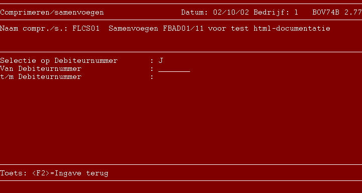 Ingave: - Selektie op <Naam veld> 1 A/N Deze vraag met J of N beantwoorden. Wordt voor 'N' gekozen, dan vindt op dit veld geen selectie plaats. Bij de tweede en volgende selectie kan men via functie- toets F2 naar het vorige selectieveld terugkeren. Ingave: - Van <Naam veld> max. lengte uit bestandsindeling Met functietoets F2 terug naar de vorige ingave. Ingave: - T/m <Naam veld> max. lengte uit bestandsindeling Met functietoets F2 terug naar de vorige ingave.Na een keuze ingaven goed (respectievelijk J of N ingeven) kan de volgende selectie worden ingegeven, of wordt het volgende programma-onderdeel, de sortering, gestart.