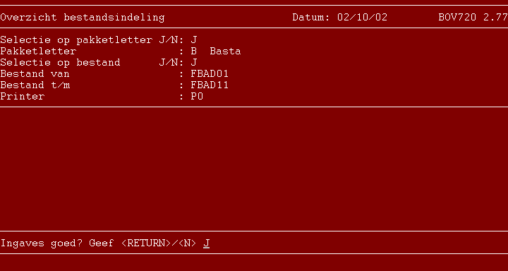 Ingave: - Selectie op pakketletter J/N 1 A/N Door met J te antwoorden kunnen de bestandsin- delingen van een bepaald pakket worden afgedrukt. Ingave: - Pakketletter (mogelijke waarden: A = Agfta, 1 A/N B = Basta, D = Drankta, K = Kavta, M = Meuta). Met functietoets F3 kan naar het pakket gezocht worden. Ingave: - Selectie op bestand J/N 1 A/N Door met J te antwoorden kan een selectie van de af te drukken bestandsindelingen gemaakt worden. Ingave: - Bestand van 6 A/N Met functietoets F3 kan naar een bestand gezocht worden. Ingave: - Bestand t/m 6 A/N Met functietoets F3 kan naar een bestand gezocht worden. Ingave: - Printer 3 A/N Geef hier de printer op, waarop de bestandsindelingen afgedrukt moeten worden.Na een keuze ingaven goed (respectievelijk J of N ingeven) worden de bestandsindelingen afgedrukt.