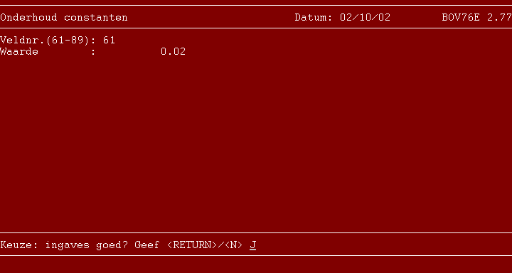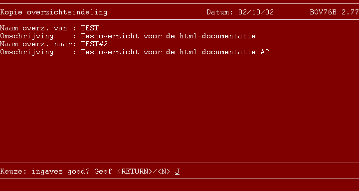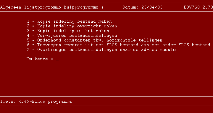 Na een keuze ingaven goed (respectievelijk J of N ingeven) wordt de betreffende keuzemogelijkheid gestart.