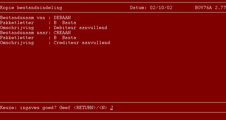 Ingave: - Bestandsnaam van max. 6 A/N Met functietoets F3 kan naar het bestand gezocht worden. Ingave: - Pakketletter (mogelijke waarden: A = Agfta, 1 A/N B = Basta, D = Drankta, K = Kavta, M = Meuta). Met functietoets F3 kan naar het pakket gezocht worden. Ingave: - Bestandsnaam naar max. 6 A/N Ingave: - Pakketletter (mogelijke waarden: A = Agfta, 1 A/N B = Basta, D = Drankta, K = Kavta, M = Meuta). Met functietoets F3 kan naar het pakket gezocht worden. Ingave: - Omschrijving max. 60 A/N Hier kan de omschrijving van een bestand worden ingegeven.Na een keuze ingaven goed (respectievelijk J of N ingeven) wordt de betreffende indeling aangemaakt.