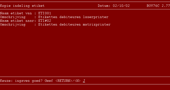 Ingave: - Naam etiket van max. 6 A/N Met functietoets F3 kan naar een etiket gezocht worden. Ingave: - Naam etiket naar max. 6 A/N Ingave: - Omschrijving max. 60 A/N Hier kan de omschrijving van het etiket worden ingegeven.Na een keuze ingaven goed (respectievelijk J of N ingeven) wordt de betreffende indeling aangemaakt.