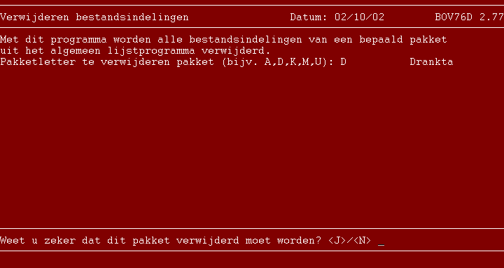 Ingave: - Pakketletter (mogelijke waarden: A = Agfta, 1 A/N B = Basta, D = Drankta, K = Kavta, M = Meuta).Na de ingave wordt de vraag "Weet u zeker dat dit pakket verwijderd moet worden? <J>/<N>" gesteld. Na ingave van J worden alle bestandsindelingen van het betreffende pakket verwijderd.
