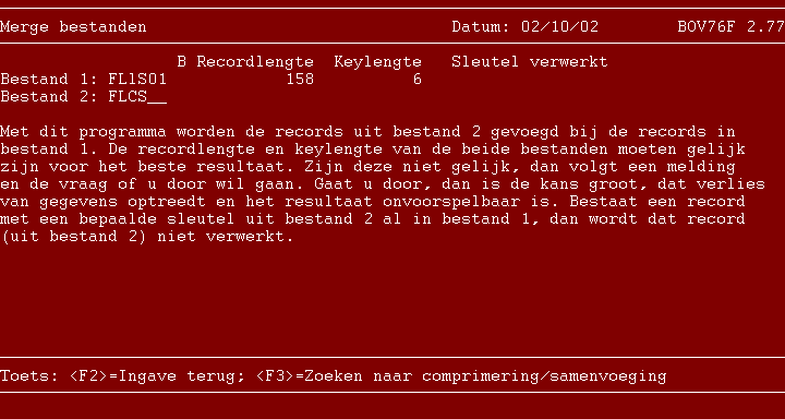 Ingaven: - Toevoeging achter FLCS van het 1e bestand 2 A/N Met functietoets F3 kan naar een compri- mering/samenvoeging gezocht worden. - Bedrijfsletter 1e bestand 1 A/N - Toevoeging achter FLCS van het 2e bestand 2 A/N Met functietoets F3 kan naar een compri- mering/samenvoeging gezocht worden. - Bedrijfsletter 2e bestand 1 A/NDe key- en recordlengtes van de bestanden worden vergeleken. Als deze niet gelijk zijn, dan wordt daarvoor gewaarschuwd en vraagt het programma of het door moet gaan. Wordt voor doorgaan gekozen, dan kan verlies van gegevens optreden (als de key- of recordlengte van het tweede bestand groter is dan die van het eerste bestand). Het resultaat wordt onvoorspelbaar als 'FLCS'-bestanden met totaal verschillende indelingen worden samengevoegd.