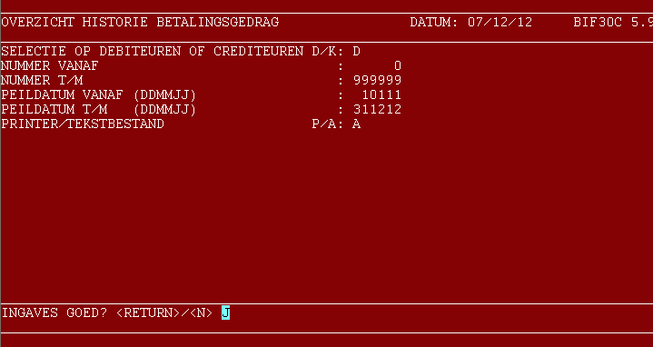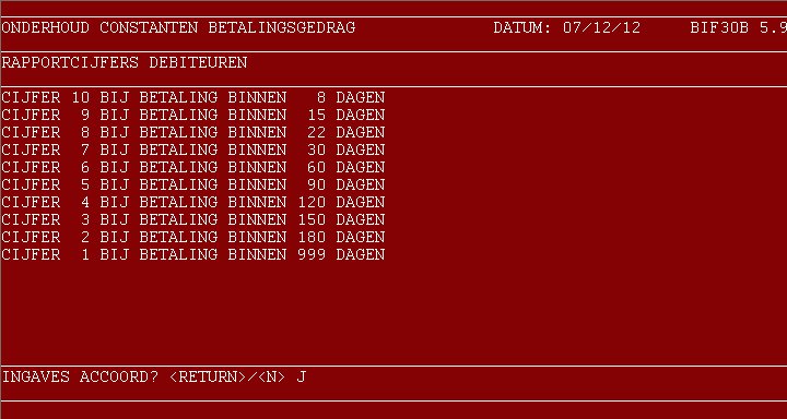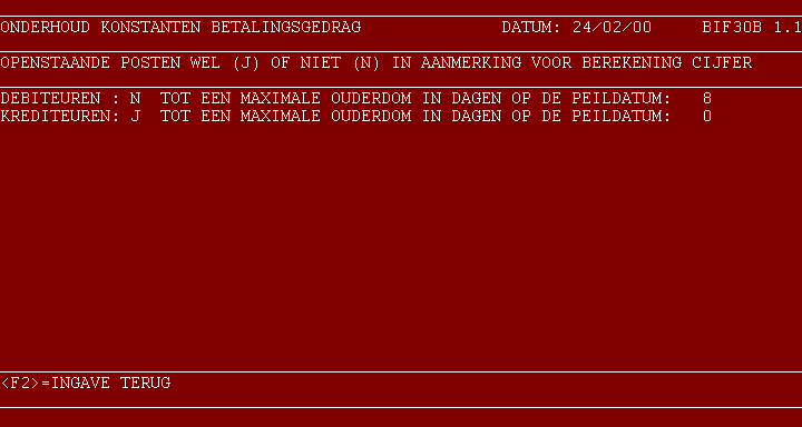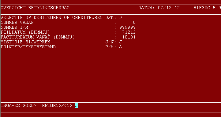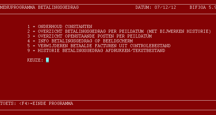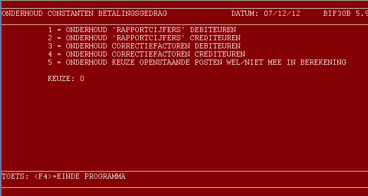 Programmanummer: 227 Omschrijving : BETALINGSGEDRAG Programmanaam : BIF300Uiteraard mag het programma ook op een andere plaats in het menu worden opgenomen. Wanneer u met meerdere bedrijven werkt, moet dit programma in elk bedrijf afzonderlijk in het menu worden geplaatst.