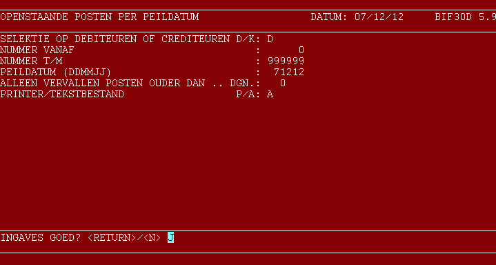 - Selectie op debiteuren (D) of crediteuren (K), geef de betreffende letter in. - Nummer vanaf. - Nummer t/m. - Peildatum. Facturen met een factuurdatum na deze peilda- tum of betalingen na deze peildatum worden niet op het overzicht meegenomen. - Alleen vervallen (dus nog openstaande) posten ouder dan XX dagen. Geef het aantal dagen, bijvoorbeeld 30, in. Met dit aantal dagen kan aangegeven worden dat alleen openstaande facturen die op de peildatum ouder zijn dan het ingegeven aantal dagen afgedrukt moeten worden. Om alle openstaande facturen op de peildatum af te drukken als aantal dagen '0' ingeven. - Printer of tekstbestand, geef P of A in. - Printernummer. Maak een keuze uit de getoonde printer- nummers (alleen bij optie "P"). Keuze: Ingaves goed? <RETURN>/<N>. Maak de gewenste keuze.Hierna wordt het overzicht afgedrukt of weggeschreven in een tekstbestand. Voor de berekeningen wordt verwezen naar het hoofdstuk Algemene werkwijze.