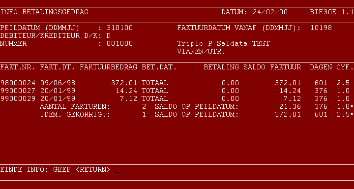 Na het tonen van de facturen komt het programma terug op de ingave van het nummer van de debiteur of crediteur, zodat meteen de volgende bekeken kan worden. Via de F2-toets kan men verder terug gaan naar keuze D/K, fakcuurdatum vanaf en peildatum. Bij het tonen van de factuurgegevens kan door ruimtegebrek op het scherm alleen het uiteindelijk berekende rapportcijfer (dus na eventuele correctie) getoond worden.