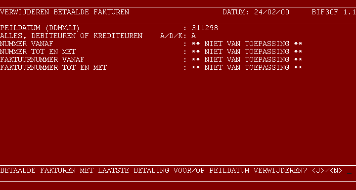 Keuze: "BETAALDE FAKTUREN MET LAATSTE BETALING VOOR/OP PEILDATUM VERWIJDEREN? <J>/<N>". Maak de gewenste keuze.