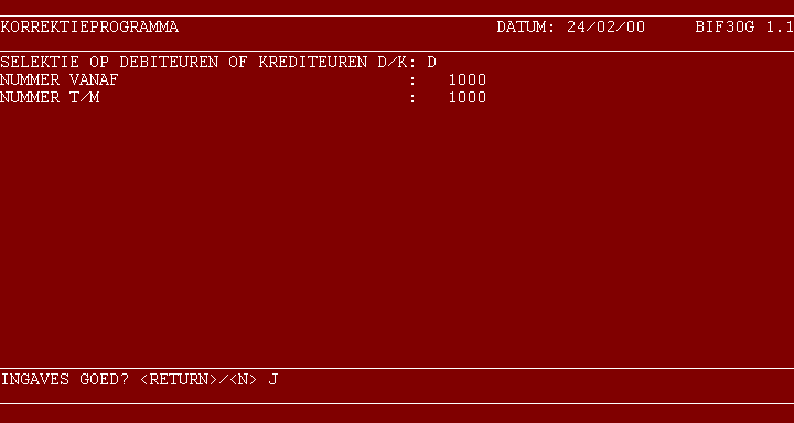De module is daarom uitgebreid met keuze 6, een correctieproprogramma. Deze keuze is echter in het menu niet zichtbaar, maar er kan wel voor gekozen worden. Vervolgens verschijnt een scherm met de vraag of het de bedoeling is of dit programma opgestart moet worden, met J of N antwoorden.
