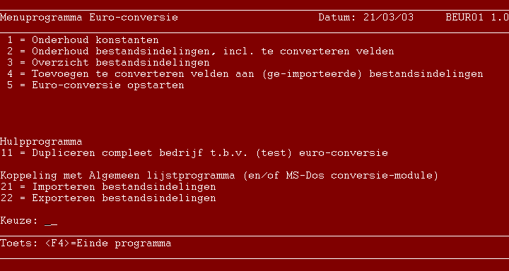 Programmanummer : 629 (of een ander vrij nummer) Omschrijving : EURO-CONVERSIE Programmanaam : BEUR00Wanneer u met meerdere bedrijven werkt, moet dit programma in elk bedrijf afzonderlijk in het menu geplaatst worden.
