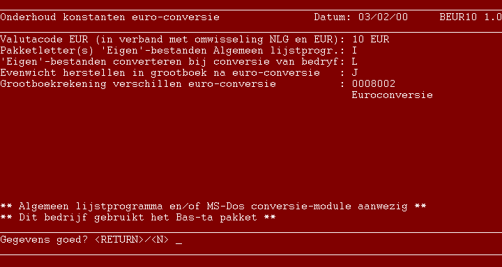 Als het programma voor de eerste keer opgestart wordt, dan meldt het programma dat de bestanden voor de euro-conversie ontbreken. Met <RETURN> de bestanden aanleggen of met <F4> het programma verlaten.