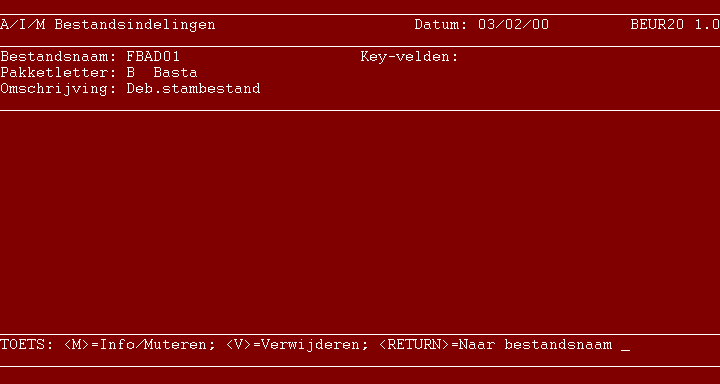 De volgende ingaven zijn mogelijk: - Bestandsnaam: Geef de naam van het betreffende bestand in. - Pakketletter: Geef de gewenste pakketletter in. Onder in het scherm staan een aantal pakketletters vermeld. - Omschrijving: Omschrijving van het bestand. Keuze: <M>=Info/Muteren; <V>=Verwijderen; <RETURN>=Naar bestandsnaam. Bij de keuze <V> meldt het programma dat na verwijderen van de indeling geen conversie meer mogelijk is. Geef <J> of <N> in.
