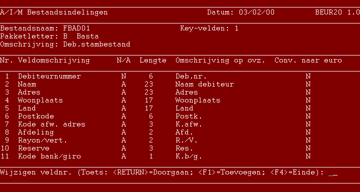 Bij de keuze <M> verschijnt de indeling van het bestand. Daarna volgt de keuze: Wijzigen veldnr. (Toets: <RETURN>=Doorgaan; <F1>=Toevoegen; <F4>=Einde). Met <RETURN> verder te bladeren door de velden. Met keuze <F1> kan een nieuw veld aan het einde toegevoegd worden en met <F4> kan het wijzigen beëindigd worden. Bij het wijzigen of toevoegen van een veldnummer kunnen de volgende velden ingegeven worden: - Veldomschrijving : Max. 20 tekens. - N/A : Numeriek of alfanumeriek. - Lengte : Lengte van het veld. Via <F3> of <F4> het aantal decimalen aangeven. - Omschrijving op ovz.: Max. 20 tekens, afhankelijk van de lengte van het veld. - Conv. naar euro : J of N. Alleen J invullen als het veld geconverteerd moet worden. Keuze: Ingaves goed <RETURN>/<N>. Maak de gewenste keuze. Bij de keuze <F4> (wijzigen beëindigen) worden de volgende vragen gesteld: - Laatste veldnummer in de key wijzigen? <RETURN>/<J>. - Laatste veldnummer in de key (1 t/m 5 toegestaan): alleen in te geven bij <J> op de vorige vraag. - Extra conversie-gegevens wijzigen? <RETURN>/<J>. Wordt bovenstaande vraag met <J> beantwoord, dan zijn de volgende ingaven mogelijk: - Keuze: Moet dit bestand leeg zijn tijdens de conversie? <J>/<N>. Wordt deze vraag met <J> beantwoord, dan wordt voor de conversie gecontroleerd of het bestand leeg is. Is het bestand niet leeg, dan wordt dat op het conversieverslag gemeld en wordt de echte conversie niet opgestart. - Extra uit te voeren conversie (alleen invullen na overleg met Saldata). Keuze: Ingaves goed: <RETURN>/<N>. Maak de gewenste keuze.Als laatste wordt de vraag "Door middel van info op bestand indeling testen? <RETURN>/<J>". Met <RETURN> of <N> terug naar de ingave van de bestandsnaam. Met <J> kunt u door de records van het bestand bladeren. In de indeling is door middel van een "J" achter het veldnummer aangegeven of het veld naar euro's geconverteerd wordt. Via <F4> kan deze keuze verlaten worden. Volg voor de overige mogelijkheden de aanwijzigen in het scherm.