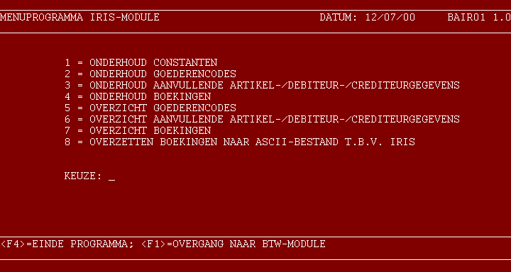 Het is niet nodig om deze module onder een bepaalde keuze in het menu op te nemen. Via de <F1>-keuze in het hoofdmenu van de BTW-module kan de IRIS-module bereikt worden. Teruggaan naar de BTW-module kan via <F1> in het hoofdmenu van de IRIS-module.
