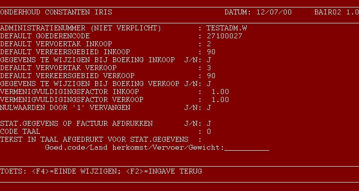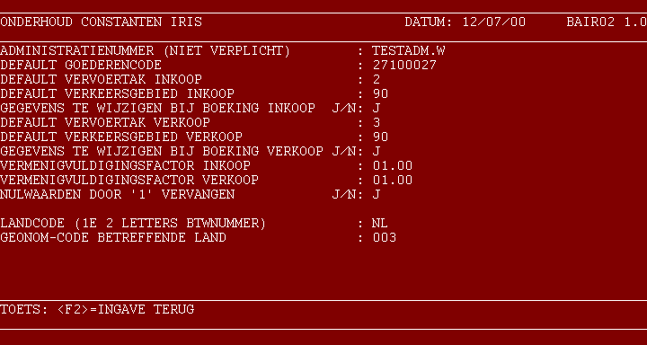De volgende velden zijn aanwezig: - Administratienummer (niet verplicht). - Default goederencode (voorheen statistieknummer). Deze code wordt voor alle artikelen gebruikt waar geen goederencode toe- gevoegd is of vermeld is dat voor dat artikel geen statistiek hoeft te worden bijgehouden, maar waar toch op geboekt wordt. - Default vervoertak (vervoerwijze) inkoop. - Default verkeersgebied (haven van lossing) inkoop. - Gegevens te wijzigen bij boeking inkoop J/N. - Default vervoertak (vervoerwijze) verkoop. - Default verkeersgebied (haven van lading) verkoop. - Gegevens te wijzigen bij boeking verkoop J/N. Bovenstaande defaults worden bij crediteuren en/of debiteuren gehanteerd als deze niet expliciet toegevoegd zijn aan een be- paalde debiteur of crediteur, maar waar toch IRIS-boekingen voor gemaakt worden. - Vermenigvuldigingsfactor inkoop (default 1.00). - Vermenigvuldigingsfactor verkoop (default 1.00). Tijdens de boekingen wordt bij een inkoop altijd de verreken- waarde (magazijnontvangsten) of de inkoopwaarde (inkoopmodu- les) doorgegeven naar IRIS en bij een verkoop altijd de ver- koopwaarde. Dit wordt als statistische waarde gehanteerd. Naar wens kan deze waarde met bovenstaand faktoren vermenigvuldigd worden. - Nulwaarden door '1' vervangen J/N. Bij het testen bleek dat IRIS helaas boekingen met in de velden gewicht, aantal of sta- tistische waarde een nul als 'fout' aanmerkt. Wordt hier een 'J' gegeven, dan worden bij een aantal of gewicht van nul deze door '1' vervangen. Een statistische waarde van nul wordt nooit vervangen. Deze dient u altijd via 'Onderhoud boekingen' of via het 'IRIS'-pakket zelf aan te passen. - De koppeling tussen landcode en GEONOM-code is per 1 januari 2006 vervallen, de betreffende velden kunnen niet meer ingegeven of gewijzigd worden.