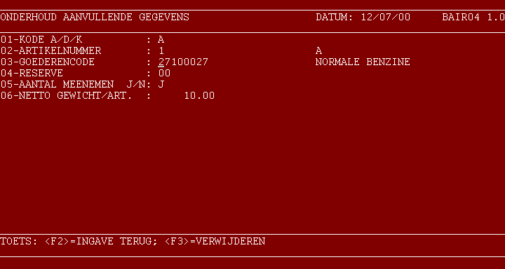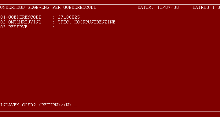Per goederencode ingeven: - Omschrijving. - Reserveveld (voorheen BOE-code [Bijzondere Opgave Energie], maar deze code is vervallen).Werkwijze: Onderhoud aanvullende artikel-/deb./crediteurgegevens