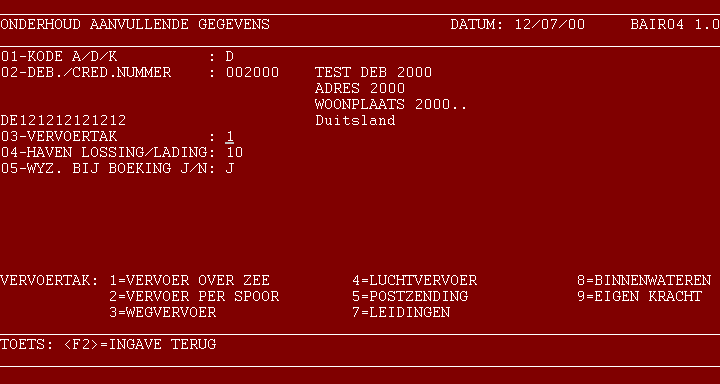 Keuze 'debiteuren' en 'crediteuren': - Ingave debiteur-/crediteurnummer of <F1> om automatisch de vol- gende debiteur cq. crediteur op te halen. Adressering wordt ge- toond, incl. het btw-nummer. Voor debiteuren of crediteuren on- der btw-nummer of binnenlandse debiteuren of crediteuren heeft het geen nut om gegevens in te voeren. Daarvoor worden geen IRIS- gegevens aangemaakt. - Vervoertak/-wijze. De mogelijke keuze's staan onder in het scherm vermeld. - Haven. Alleen bij vervoertak/-wijze '1', '4' en '8' in te ge- ven, bij de andere kodes wordt '90' vermeld. Voor de mogelijke inhoud van dit veld wordt u naar de CBS-gegevens verwezen. - Wijzigen bij boeking J/N. Indien 'J', dan kunnen tijdens de boeking de velden 'vervoertak/-wijze' en 'Haven van lossing cq. lading' voor die boeking gewijzigd worden. Indien de defaultwaarden uit het constantenbestand van toepas- sing zijn door een bepaalde debiteur of crediteur, dan niets ingeven.Werkwijze: Onderhoud boekingen